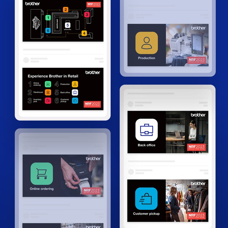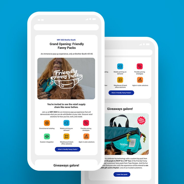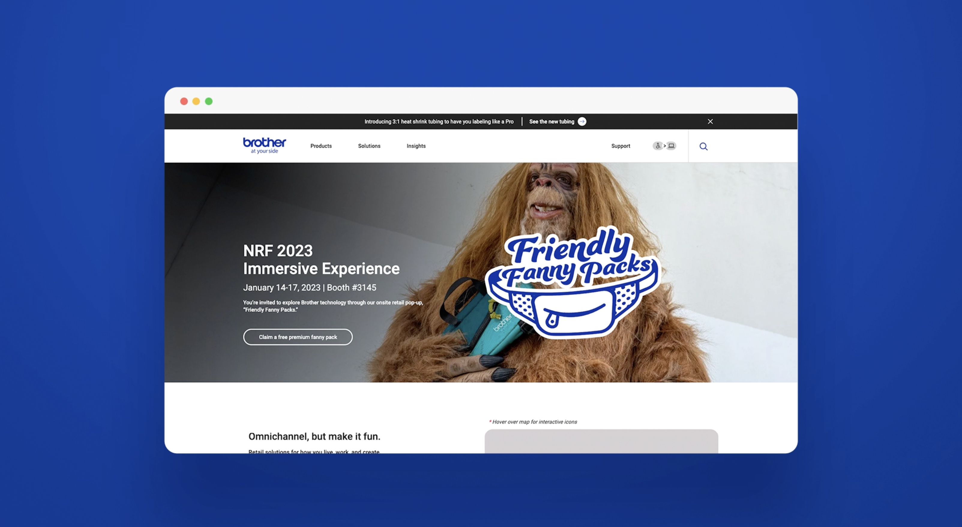 Marketing a company with over 100 years of product development behind their name requires fresh ideas mixed with a lot of on-site fun. Over the years, I have helped lead and direct multiple projects providing creative direction and for this booth the “big idea” of Sasquatch. I always love an element of surprise :). Results from the booth? Visitors raved and Brother experienced their highest-ever engagement at NRF. The “one Brother” retail store approach won several internal awards and re-set the bar for future collaborations between Brother business units.