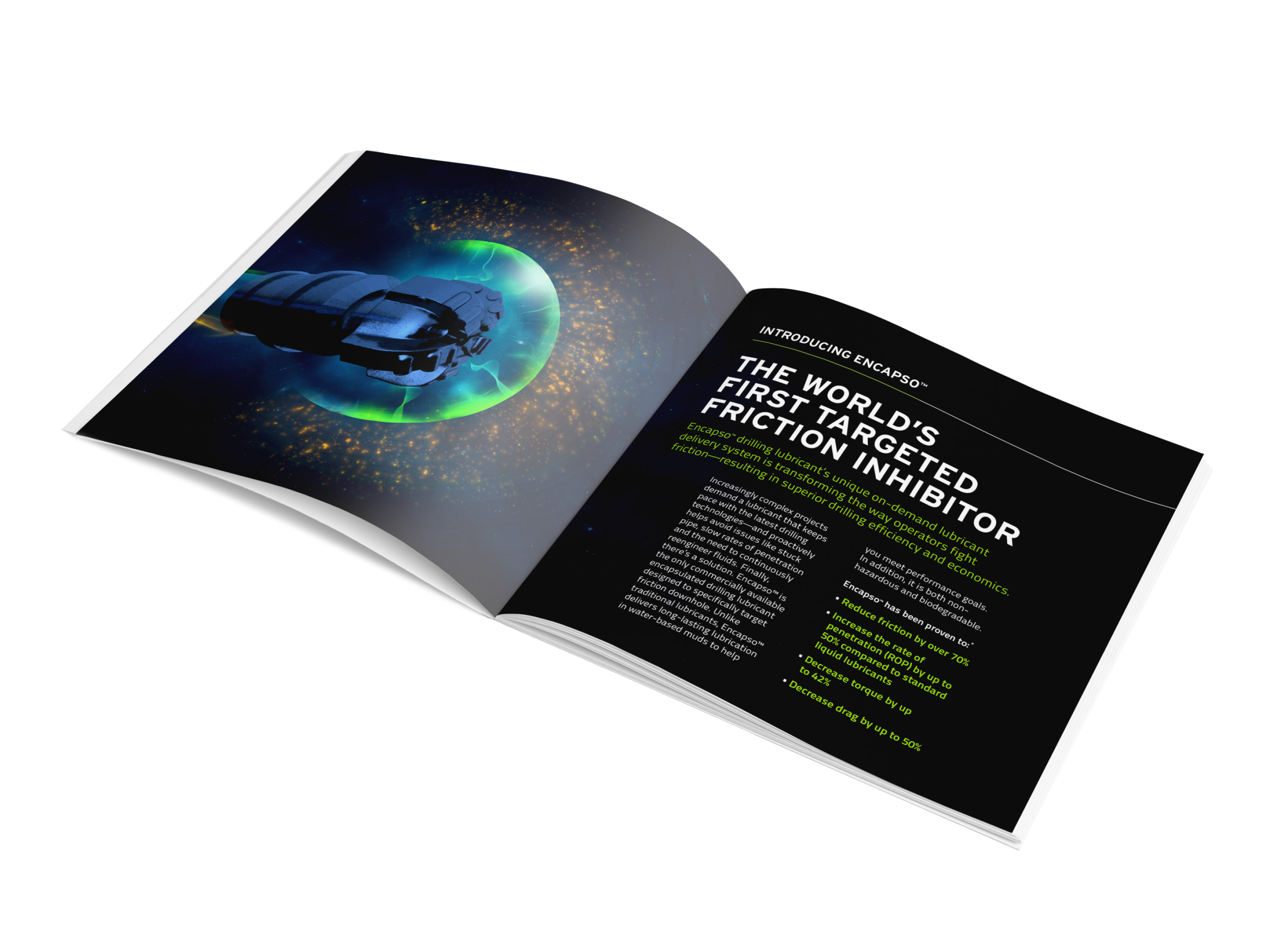 Encapso was an innovative new product on the market. To best feature the new technology, we designed the collateral, branding, and tradeshow booth in a bold, sleek way, unlike other products available at the time in the industry. The “high-performance” message spoke to both Encapso as a high-performing product, and how it enhanced the performance of an oil well by making it operate more efficiently. We even handed the actual product out at tradeshows in test tubes for potential customers to experience it for themselves.